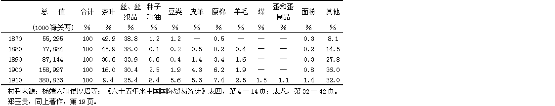 丝和茶在南京条约之前已经是中国最重要的出口货,在清朝灭亡之前这两项商品继续保持这个地位。但是它们合起来在出口贸易中的相对地位是在不断下降。茶叶出口的减少在很大程度上是因为中国的出口商面临着日本和印度日益激烈的竞争而又不能在产茶者和中间商内部贯彻质量标准。丝织品出口的庞大的绝对数量说明了这一主要的农村手工业还继续有力量;同时,豆油、皮革、面粉、蛋、蛋制品和出口增长程度稍小的皮棉却脱颖而出,这反映了进入本世纪之际在大、中城市建立了许多小工业工场的情况。