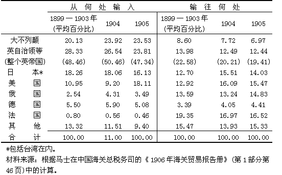 香港名义上占中国对外贸易数量的很大部分,却又缺乏1932年前从香港输入和输至香港的货物的数据,这样就不能精确说明与各国进行贸易的比重。表十九提供了1871—1911年期间选择的几年每个国家在中国对外贸易中所占的未经调整的百分比,而表二十则显示了马士为帝国海关计算的每个国家的百分比,他的计算把香港作为一个中国港口,它的进口数和出口数分别被列入表内几个主要贸易国家的数字中。联合王国在十九世纪末之前是中国最重要的贸易伙伴——如果拿整个英帝国来考虑,那么在进入二十世纪后它仍是最重要的。英国在中国进口贸易中的优势最为显著,如上所述,这是因为从兰开夏进口了棉布,从印度进口了棉纱和鸦片。虽然英国的总的比重依然是最大的,但也在减少。从十九世纪九十年代起,日本的贸易由于受到了马关条约的条款和1905年以后它在满洲所起作用的推动,发展很快。美国和俄国在中国的贸易中所占的比重总的说是在增加。