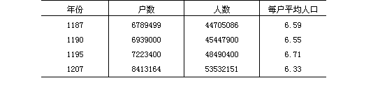 由于我们看不到金朝早期的数字,因此人口的增长只能以20年为一个周期来估算,即平均每年的人口增长率是0.9%。如果将其与中国历史上其他时期的数字相对照(例如,在1779年到1794年间人口平均增长率是0.87%),这个数字肯定是合理的。在金朝,每户的平均人口数多少要高于其他朝代通常的五到六人。金朝的户规模较大,原因是奴仆使用的普遍。例如,在1183年的籍户中,猛安谋克户的户平均人口为7.8人,而每户平均占有的奴仆数则不少于2.18人。皇族每户拥有的奴仆人数更为可观,每户超过163人。如果将所有这些因素都考虑在内的话,可以推定,作为一个社区内的生活和消费单位中的核心家庭,它的规模与中国历史上其他时期的家庭是大抵相同的。