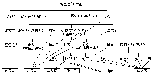 注:带*记号者曾任夷离堇。如表所示,有人任此职不止一次。标明庙号的是阿保机的直系祖先。