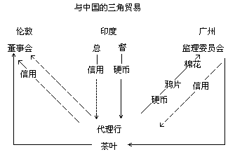 东印度公司垄断了中国的茶叶收购,因此,港脚商(即在印度得到该公司许可而由散商经营的商号)从印度运往中国的商品不得不在中国统统换为低价货如糖或者中国白铜(即锌,有时是锌与铅、铜的合金),或者只换成硬币。因此,需要大量银行业务来结算利润。有三种办法可以使东印度公司用这些巨额收益获得硬币和增殖利润,因为这时该公司在广州维持这一贸易体制迫切需要巨额费用和预付款。第一,印度管辖区之一可以向某代理行预付卢比,该代理行即购印度棉花运往广州出售以换取西班牙银元,然后从中扣除港脚商人的利润而将余款交东印度公司商馆帐房。第二,驻广州的商馆可以接受某一港脚商人的硬币而付给他可在伦敦或孟加拉兑现的汇票。最后在下列情况下信用可以在帐房中过户:(一)如果东印度公司欠行商甲一笔预付款,(二)甲可以从港脚商人乙购买棉花和鸦片,(三)因此,甲能把他的东印度公司欠款过户给乙,然后,(四)乙可利用由伦敦董事会承付的汇票将款汇往伦敦。