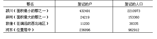 到了前汉后期,郡的数量增加到83个,原因是庆祝接管了王国的领地,把大郡划分为小郡,和把势力伸入中亚和其他新领土之中。按已掌握的下一个行政单位的表格,公元140年共有80个郡。[3] 郡的大小不论在面积上和人口上,都相差很大。公元1—2年的统计提出了几个有代表性的郡的数字,见表11。